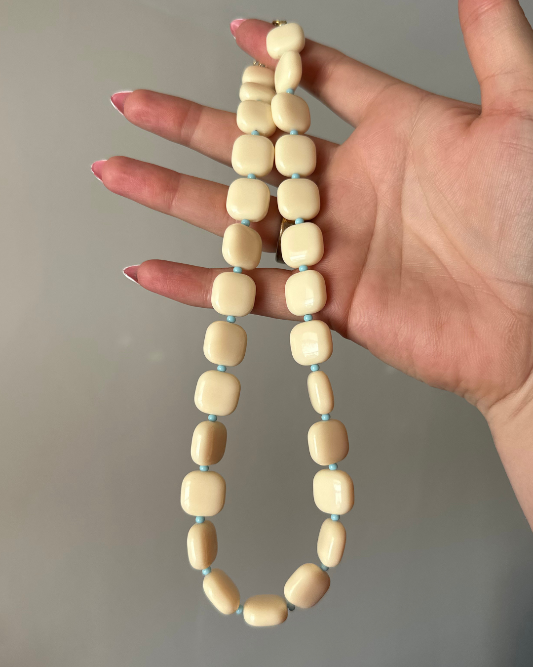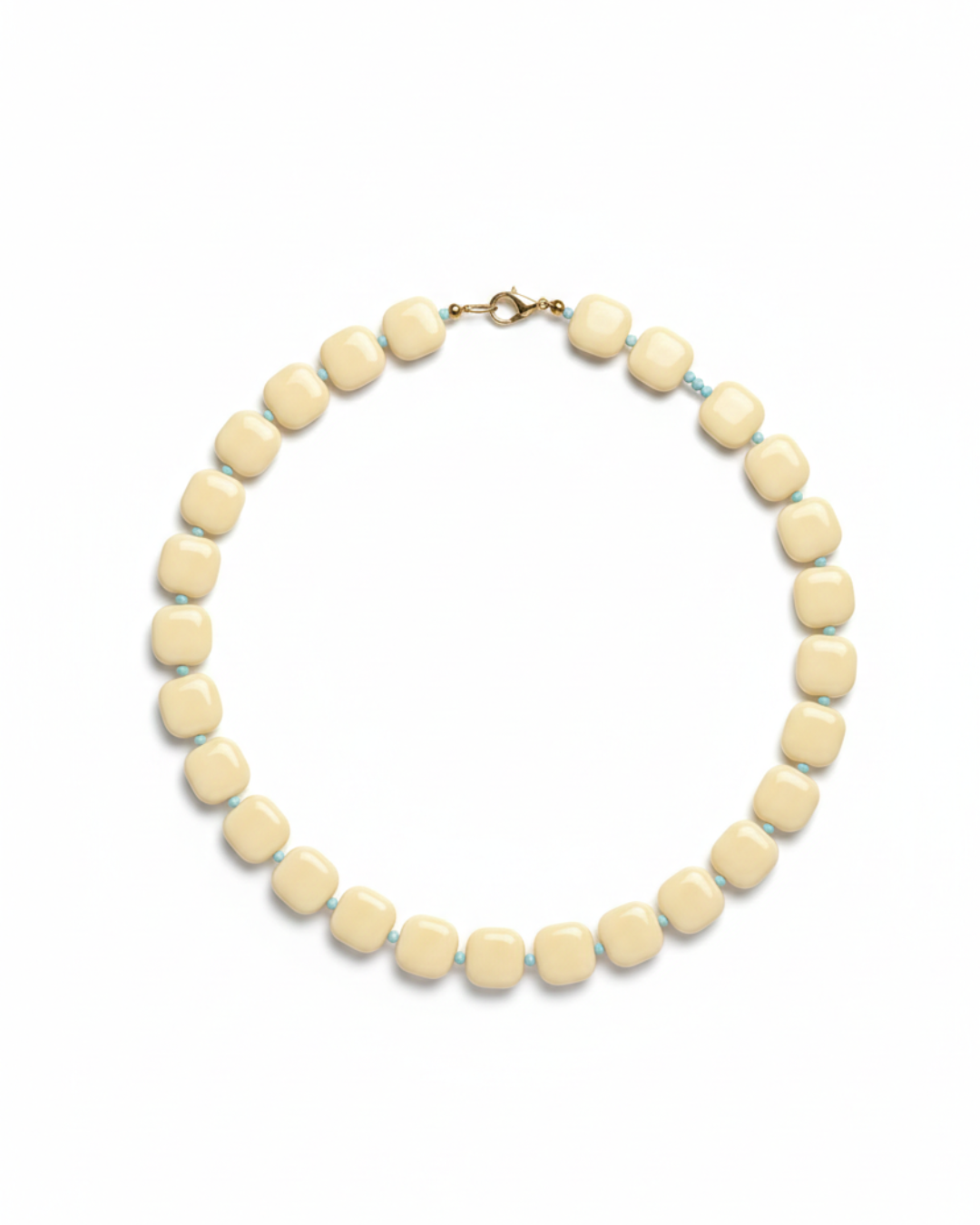 This soft and sunny beaded necklace features beautiful butter-yellow acrylic square beads, delicately spaced with baby blue seed beads for a fresh, playful contrast. Lightweight and effortlessly charming, this piece adds a subtle pop of color to any outfit.